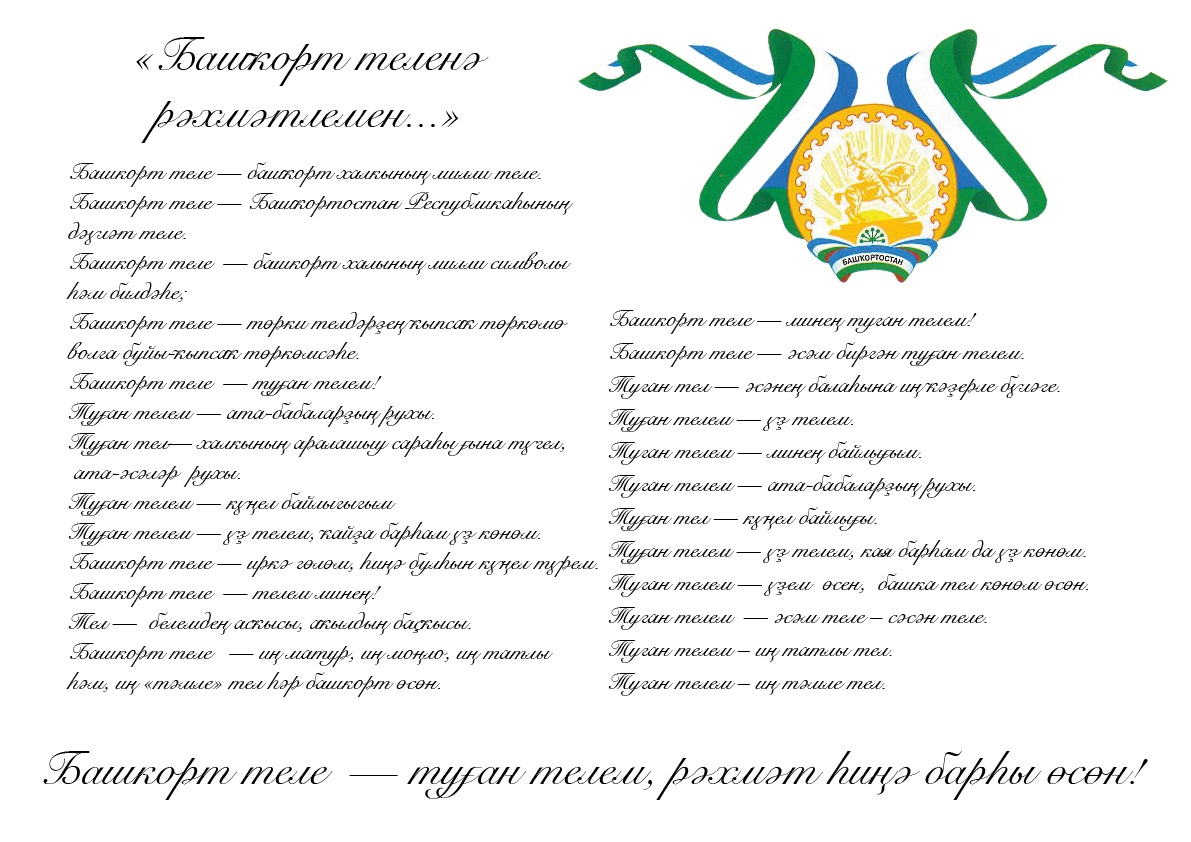 Беҙҙең ата-бабаларҙан мираҫ булып яҙылған тыуған телебеҙ - иң затлы төрки телдәрҙең береһе. Андағы һүҙҙәр аша бик боронғо көн күреш, гореф-ғәҙәттәре, халыҡтың үткән тарихы, рух ныҡлығы, өмөт-ышанысы, батырлығы, шаянлығы, етеҙлеге – бөтә сифаттары ла сағыла. Ул ҡанға һеңгән, гендарҙа тел теркәлгән.